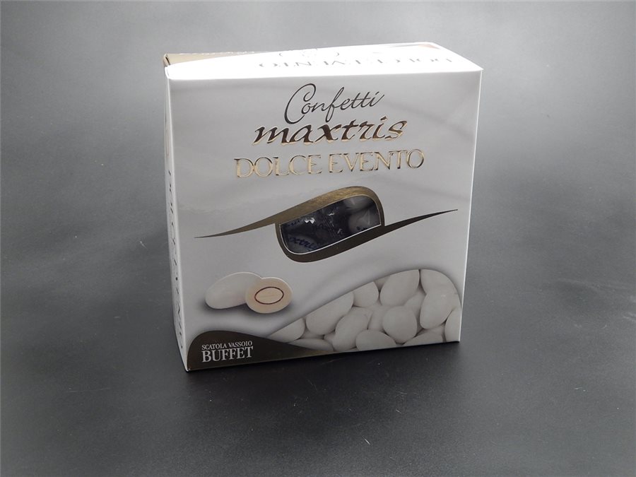 Confetti Maxtris Dolce Evento - Confezione vassoio da gr.500 di confetti maxtris classico incartati singolarmente. INGREDIENTI: Cioccolato Bianco(40%) (Zucchero, Latte intero in polvere; Burro di cacao; Latte scremato in polvere; Emulsionante: lecitina di soia. Aroma naturale di vaniglia), Zucchero Cioccolato Fondente (19%) (Pasta di cacao, Zucchero, Burro di cacao. Emulsionante: Lecitina di soia. Aromi), Mandorle (18%) Maltodestrina, Biossido di Titanio (E171). Agenti di rivestimento: Cera Carnauba (E903), Cera d'api (E901), Caco min.35% nel cioccolato fondente. Coloranti esterni: Rosa (E120) Celeste (E131) Rosso (E120)