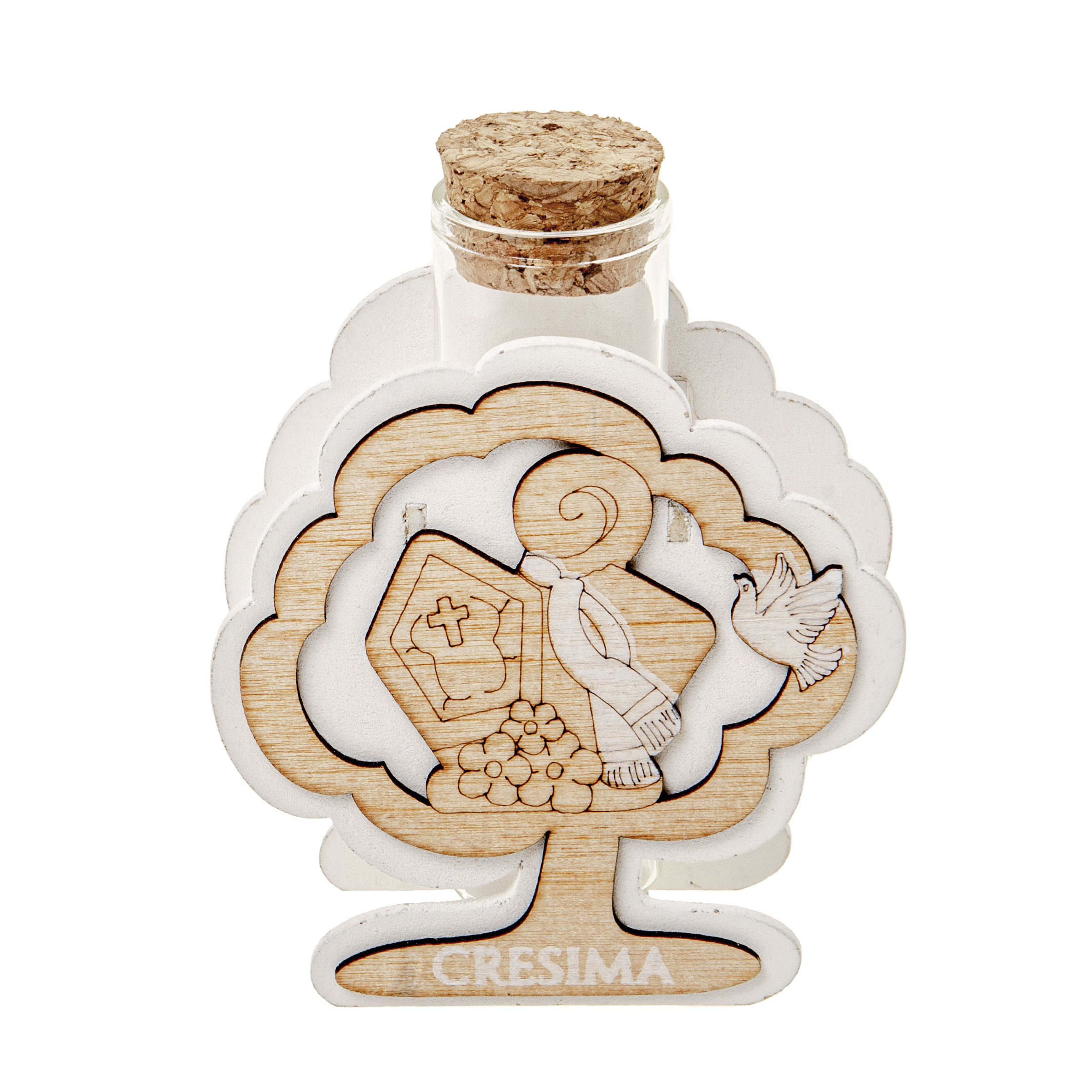 Porta confetti in legno con fiala in vetro cresima cm.9,5
