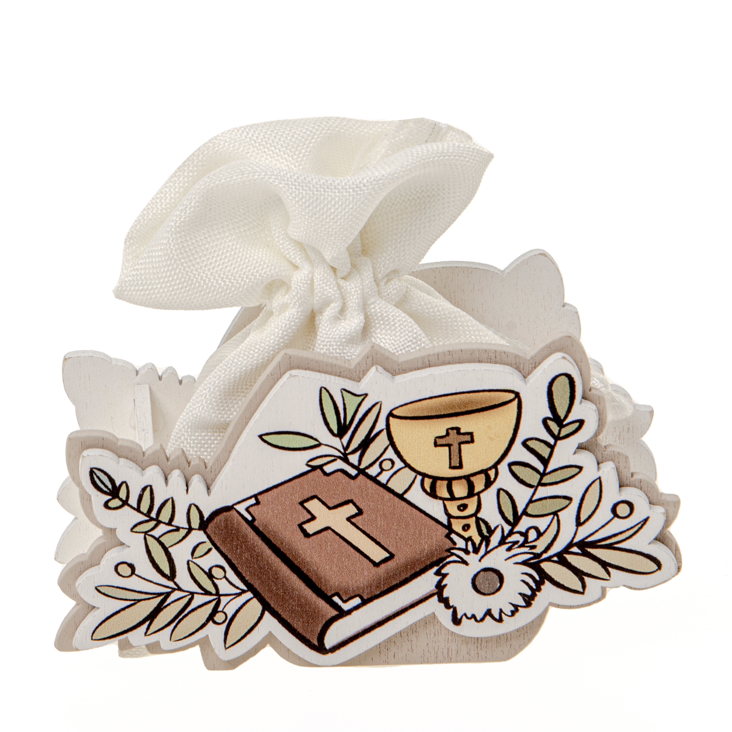 Porta confetti in legno con sacchetto in stoffa comunione cm.8