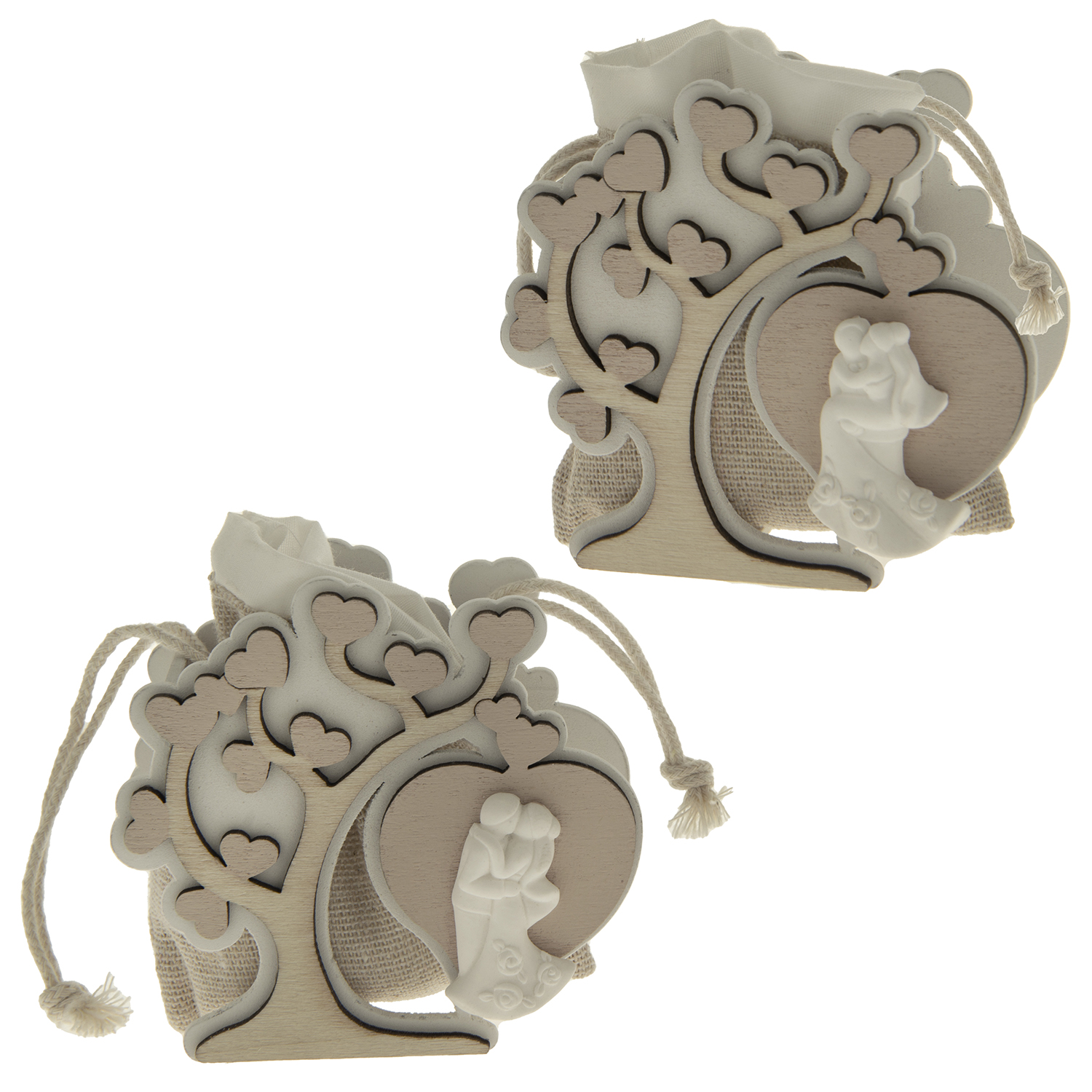 Sacchetto con albero della vita e cuore con sposi in gesso ed inserto in legno cm.h.8