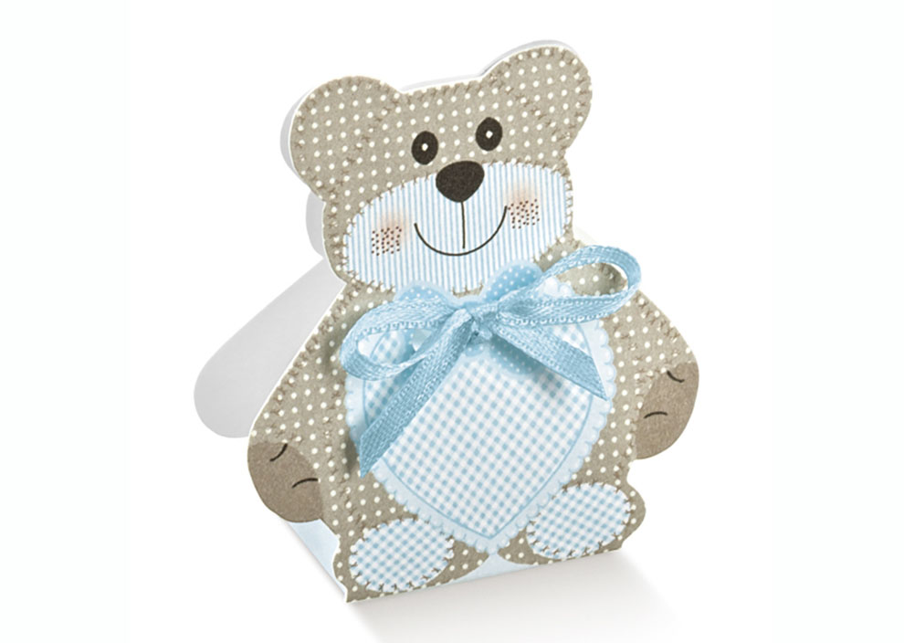 Scatola in cartoncino teso a forma di orsetto, per contenere confetti, prodotti dolciari, piccoli oggetti. E' provvista di fori per la legatura con nastro. - Nastro non Incluso - Misure mm.35x25x60