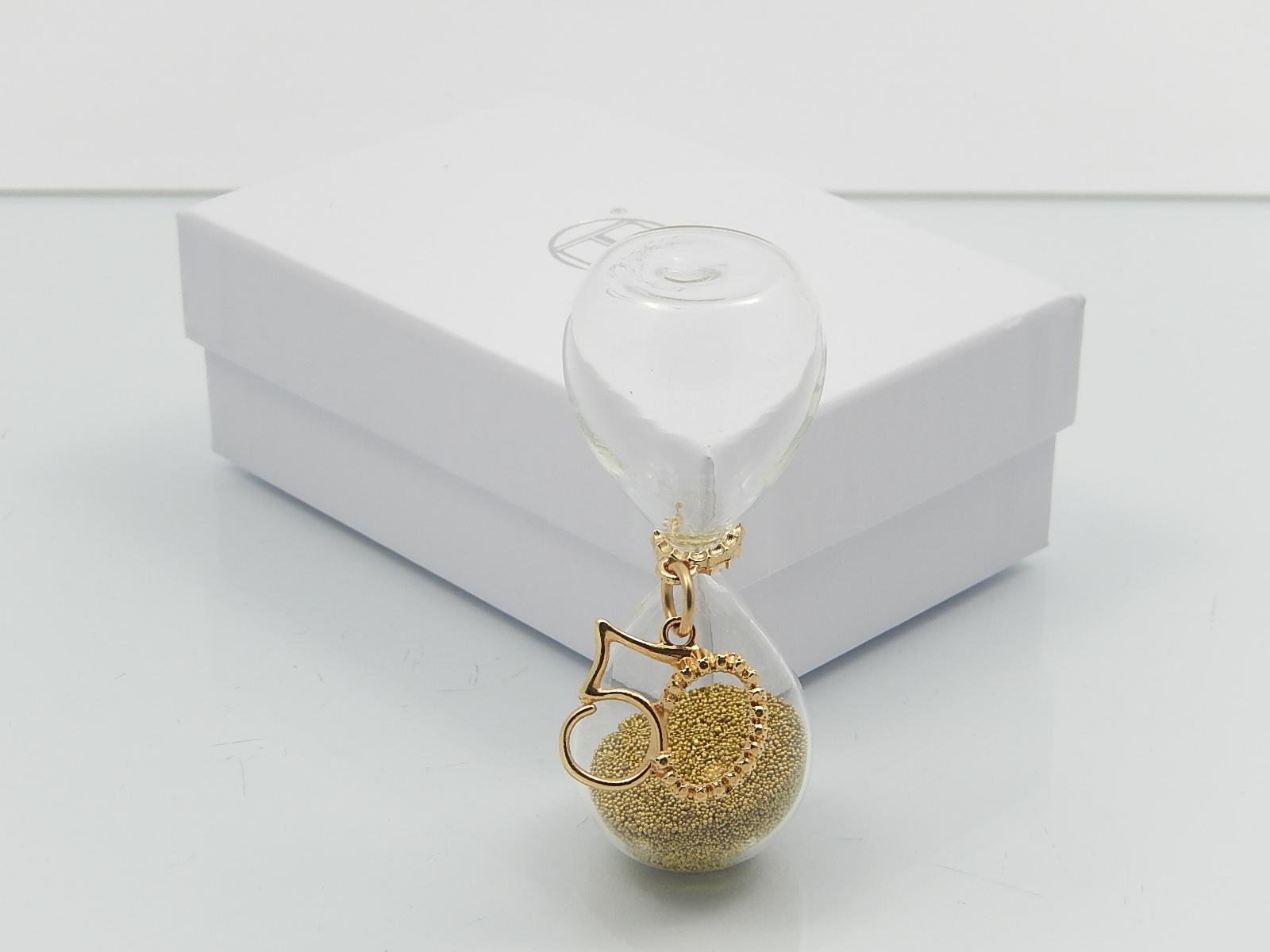 Clessidra in vetro con sabbia dorata e con applicazione 50° h.cm.8 - inclusa di astuccio regalo di cartone