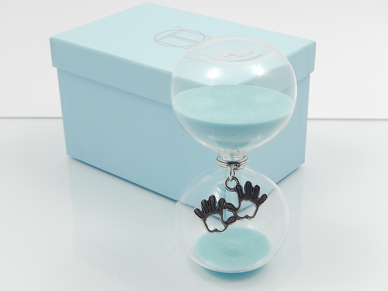 Clessidra in vetro con sabbia celeste cm.h.13 con applicazione mani - inclusa di astuccio regalo di cartone