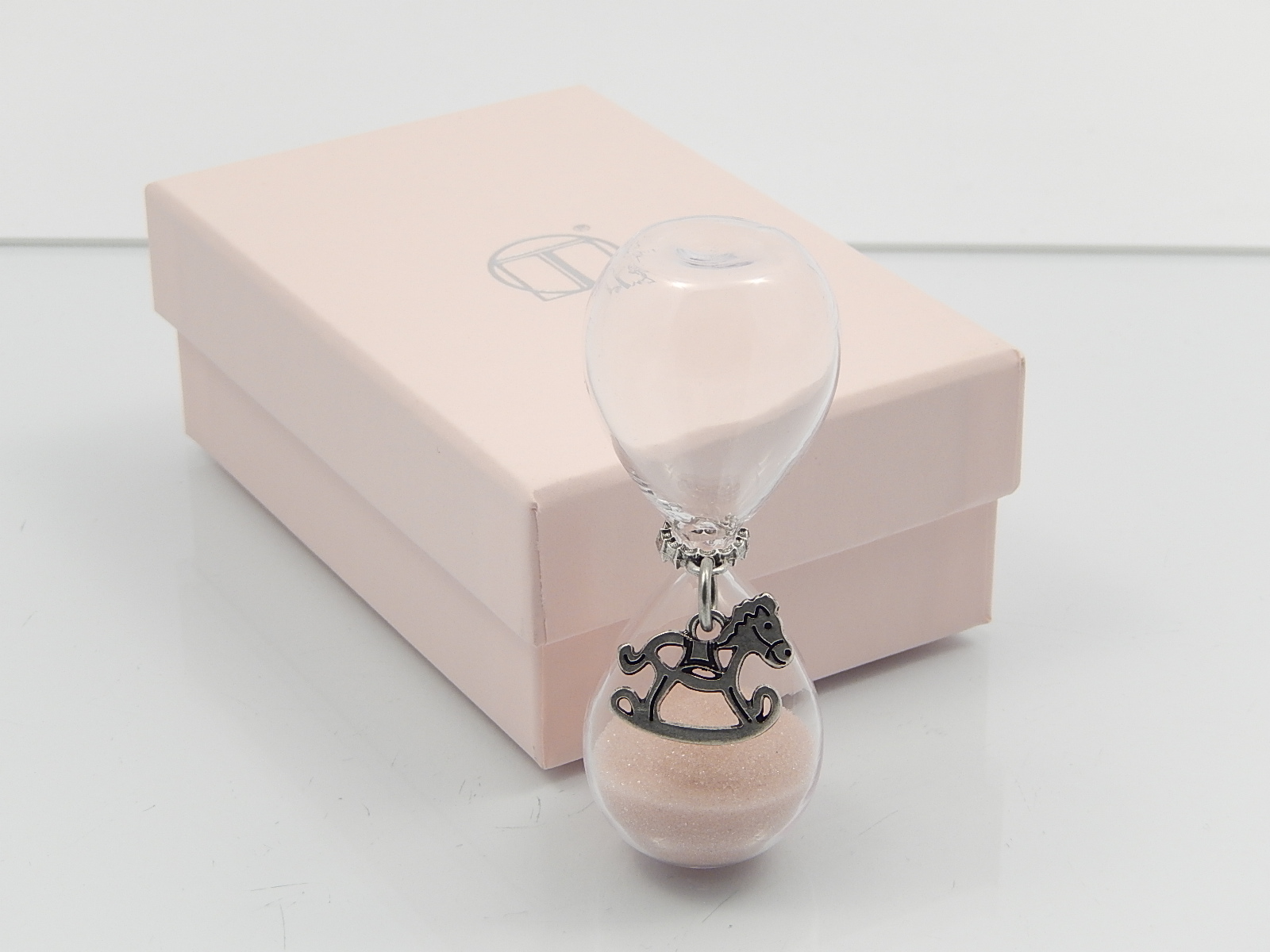Clessidra in vetro con sabbia rosa cm.h.8 con applicazione cavallino a dondolo - inclusa di astuccio regalo di cartone