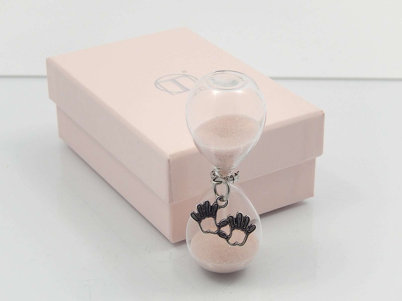 Clessidra in vetro con sabbia rosa cm.h.8 con applicazione mani - inclusa di astuccio regalo di cartone
