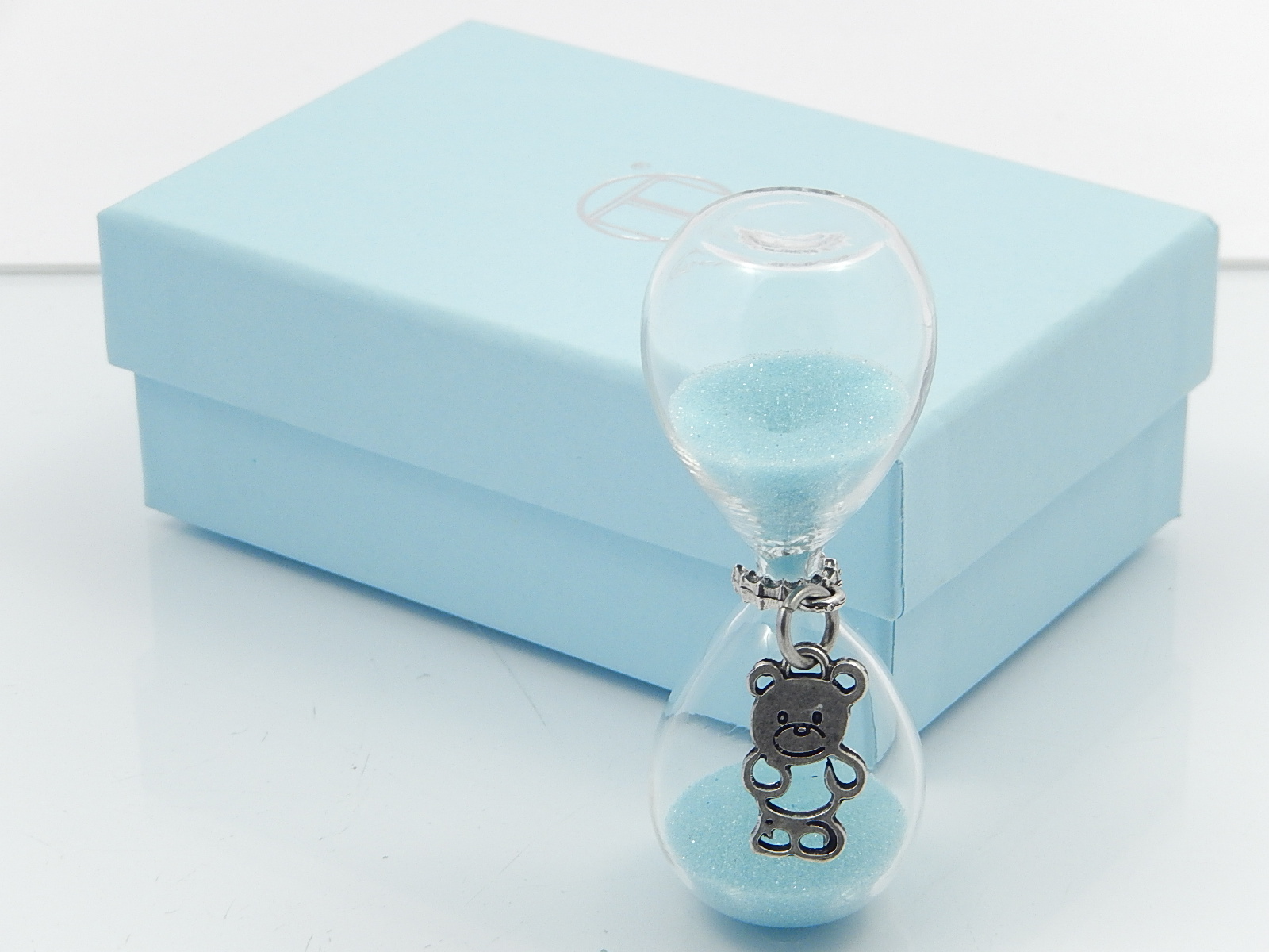 Clessidra in vetro con sabbia celeste cm.h.8 con applicazione orsetto - inclusa di astuccio regalo di cartone