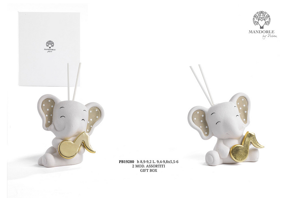 MANDORLE-Profumatore elefante con nota musicale oro  cm.9,2 con astuccio regalo (Il prezzo è riferito al singolo pezzo)