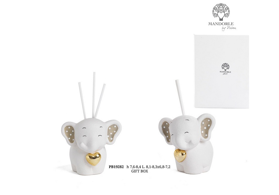 MANDORLE-Profumatore elefante due modelli assortiti cuore oro con luce led  cm.8,4xh.7,6 con astuccio regalo (Il prezzo è riferito al singolo pezzo)