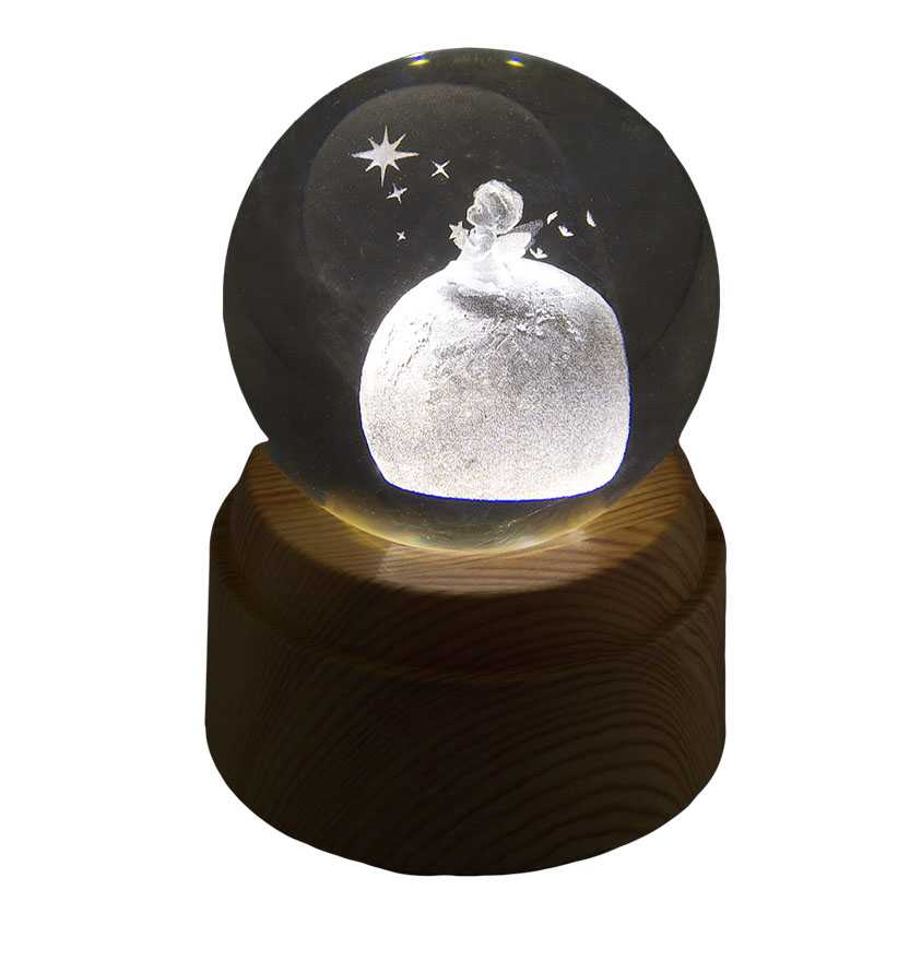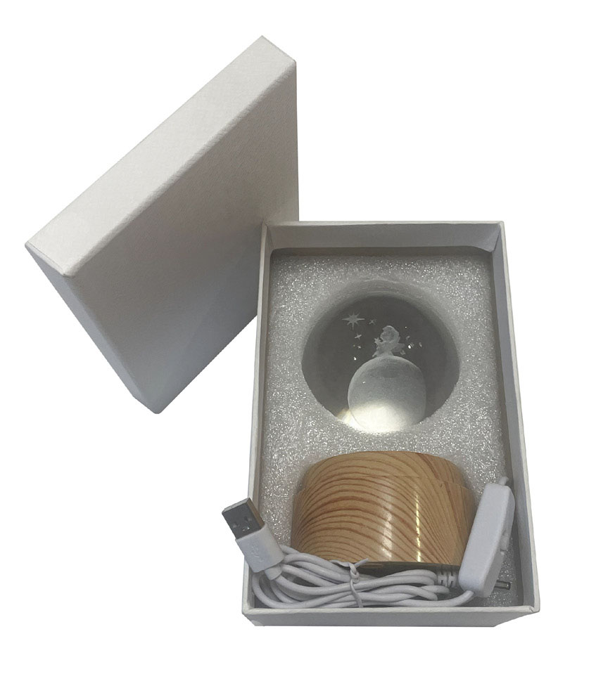 Sfera luce led usb in cristallo ø 60mm decoro Angelo su Pianeta - base rotativa di legno - inclusa di astuccio