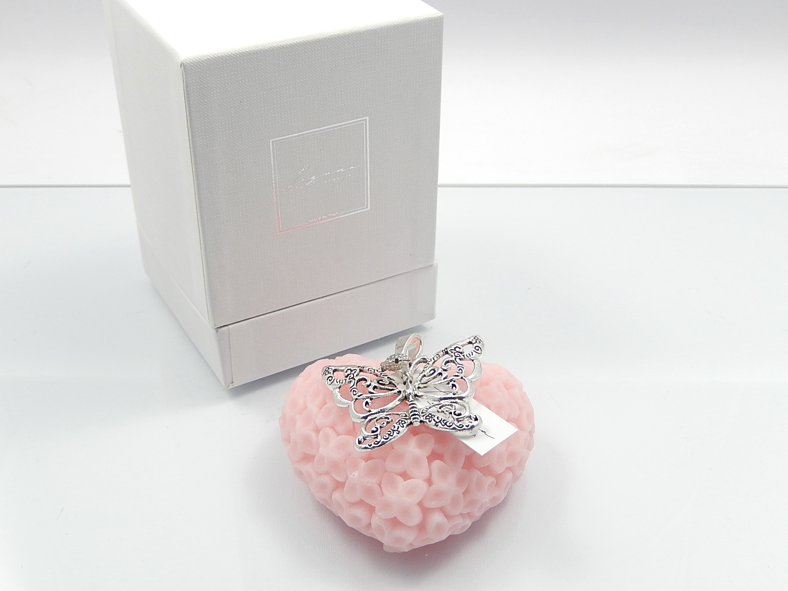 LAGUNA-Candela cuore petali rosa con piattino in gesso e farfalla
