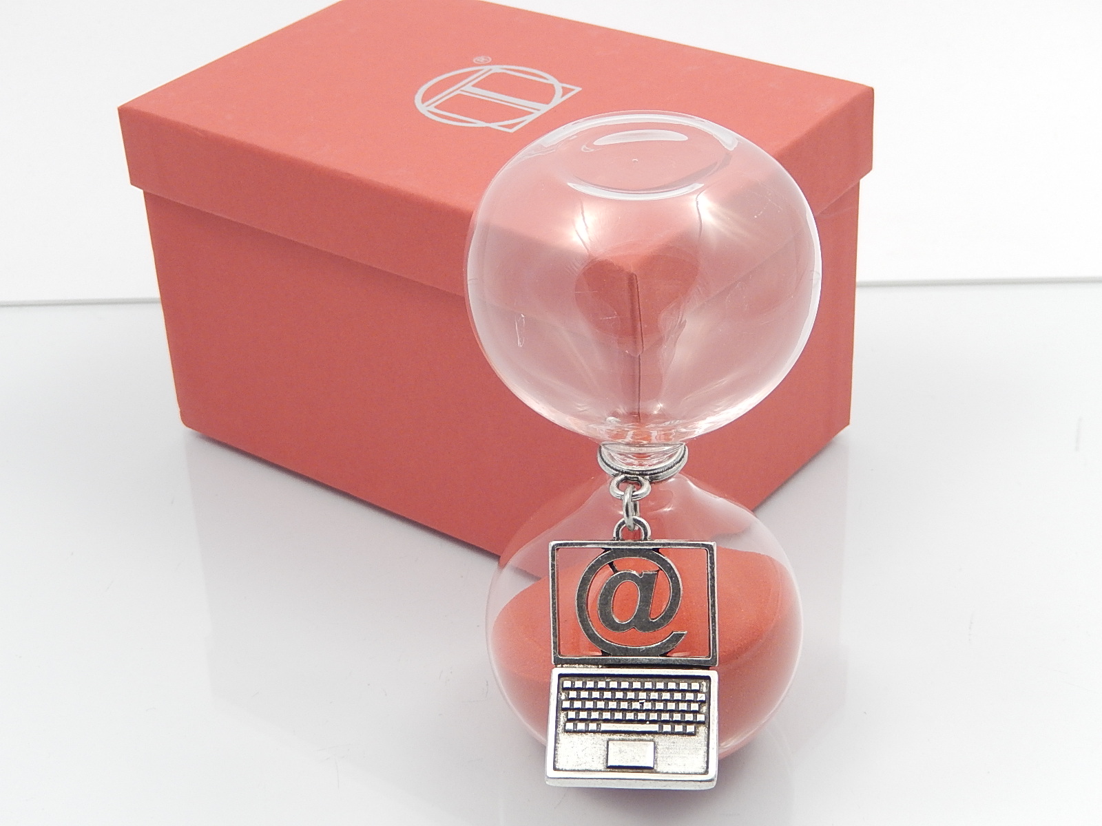 Clessidra in vetro con sabbia rossa cm.h.13 con applicazione computer - inclusa di astuccio regalo di cartone