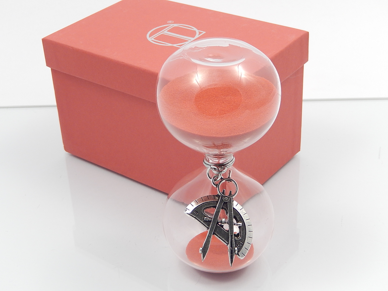 Clessidra in vetro con sabbia rossa cm.h.13 con applicazione goniometro - inclusa di astuccio regalo di cartone