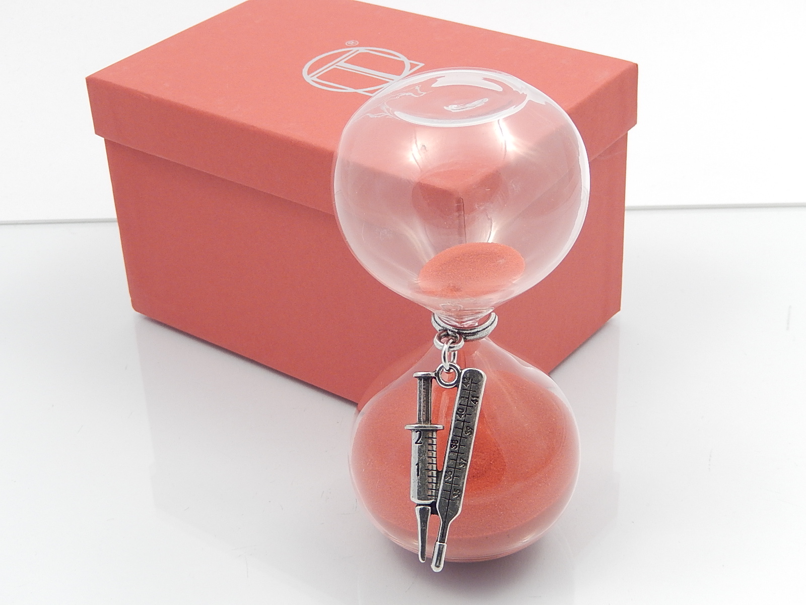 Clessidra in vetro con sabbia rossa cm.h.13 con applicazione siringa - inclusa di astuccio regalo di cartone