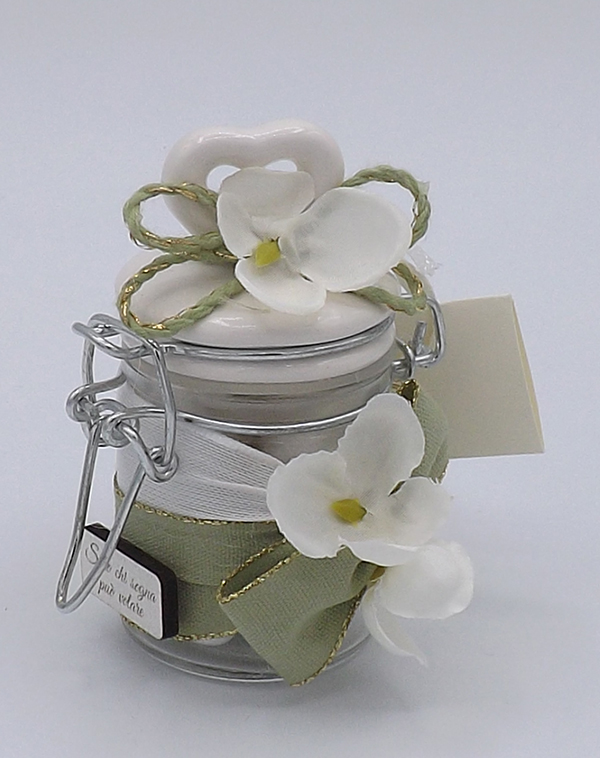 Barattolo di vetro con tappo a cuore poccolo - incluso di 9 confetti cioccolato bianchi e biglietto bomboniera stampato - cm.D.5xh.9 (Inserire nelle note dell'ordine i dati per la stampa del biglietto ed il tipo di ricorrenza)