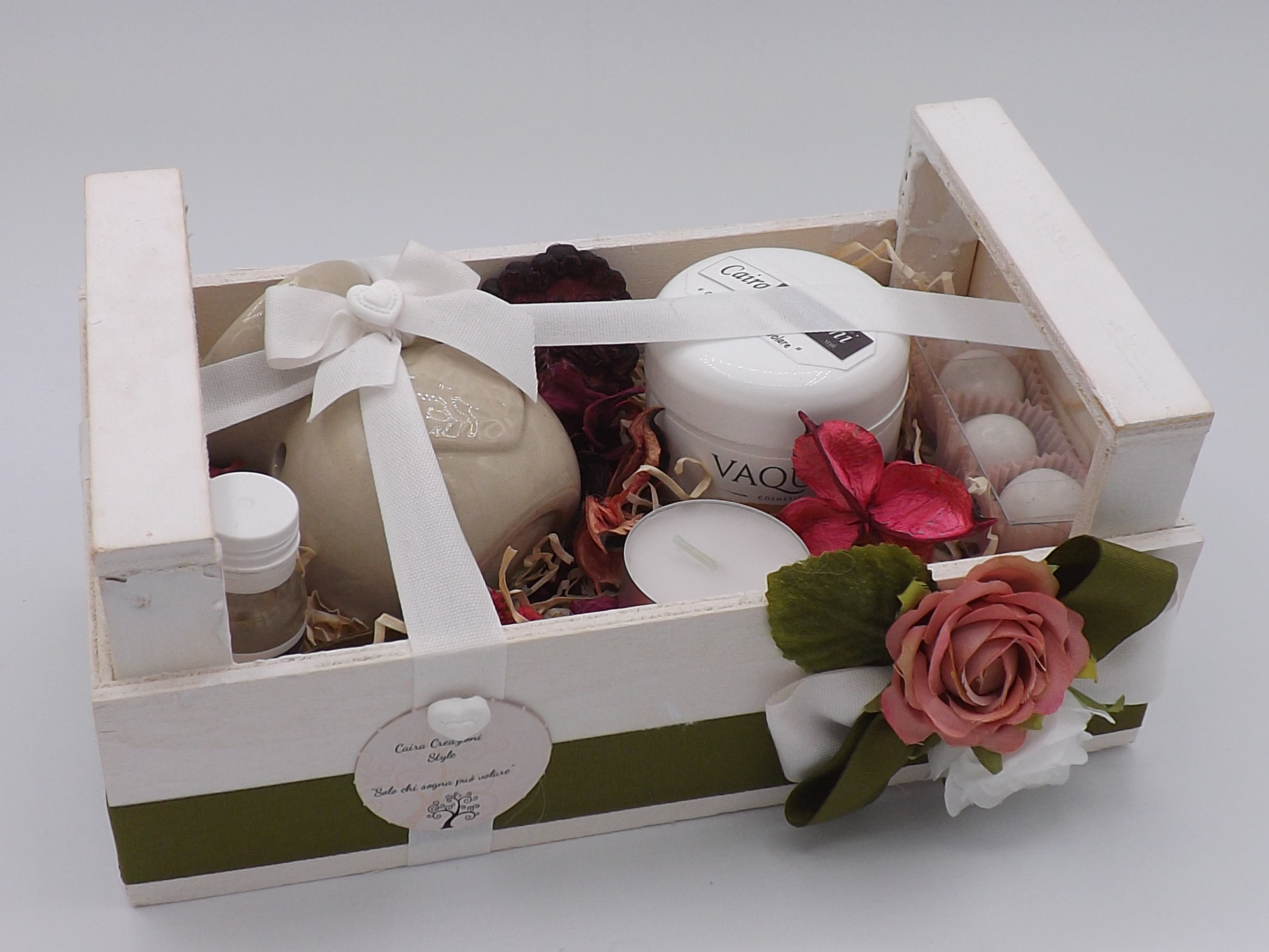 Cassetta legno grande con crema scrub e bruciatore assortito - incluso di 3 choc bon bianchi e biglietto bomboniera stampato - cm.21x12xh.9 (Inserire nelle note dell'ordine i dati per la stampa del biglietto ed il tipo di ricorrenza)