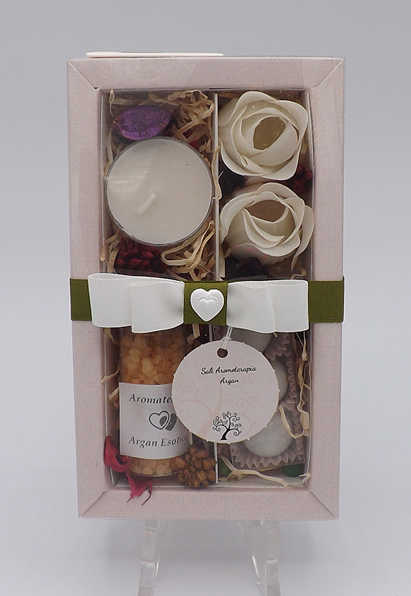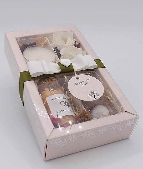 Scatola con fiore con sali, rosa sapone, candela - incluso di 3 choc bon bianchi e biglietto bomboniera stampato - cm.14.5x14.5xh.4 (Inserire nelle note dell'ordine i dati per la stampa del biglietto ed il tipo di ricorrenza)