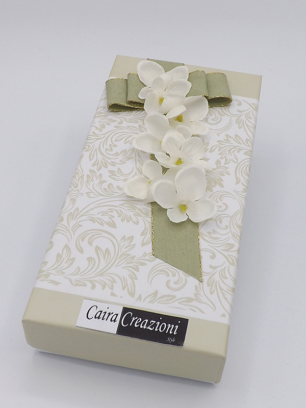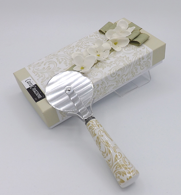 Scatola con tagliapizza - incluso di 5 confetti mandorla bianchi e biglietto bomboniera stampato - cm.10xh.19 (Inserire nelle note dell'ordine i dati per la stampa del biglietto ed il tipo di ricorrenza)
