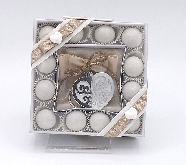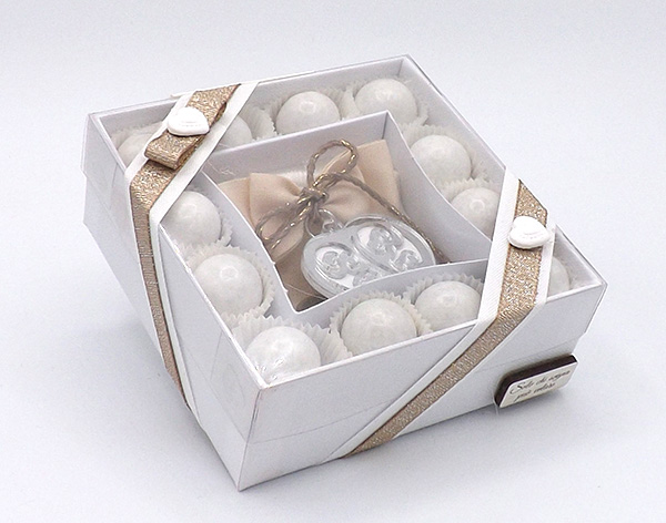 Scatola trasparente con portachiavi albero tre soggetti assortiti - incluso di 12 choc bon bianchi e biglietto bomboniera stampato - cm.10x10xh.4 (Inserire nelle note dell'ordine i dati per la stampa del biglietto ed il tipo di ricorrenza)