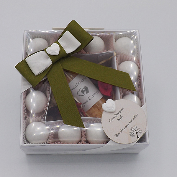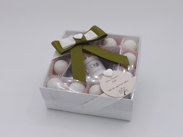 Scatola trasparente con sali all'argan - incluso di 12 choc bon bianchi e biglietto bomboniera stampato - cm.10x10xh.4 (Inserire nelle note dell'ordine i dati per la stampa del biglietto ed il tipo di ricorrenza)
