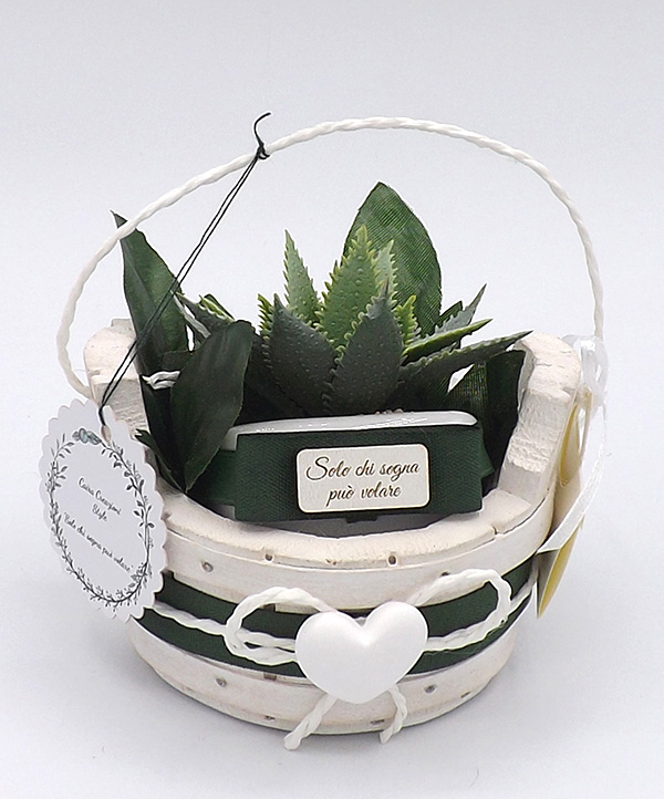 Tinozza in legno con vasetto piantina e calamita assortita - incluso di 5 confetti mandorla bianchi e biglietto bomboniera stampato - cm.D.9xh.12 (Inserire nelle note dell'ordine i dati per la stampa del biglietto ed il tipo di ricorrenza)