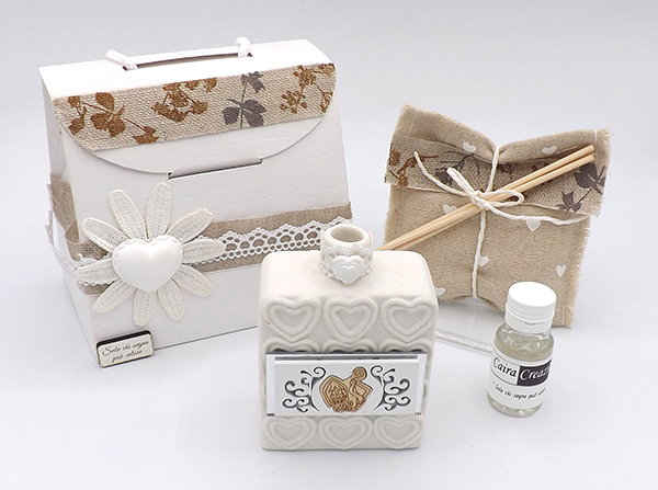 Valigetta in cartone con profumatore cuore cresima e sacchetto - incluso di 5 confetti mandorla bianchi e biglietto bomboniera stampato - cm.13x8xh.12 (Inserire nelle note dell'ordine i dati per la stampa del biglietto ed il tipo di ricorrenza)