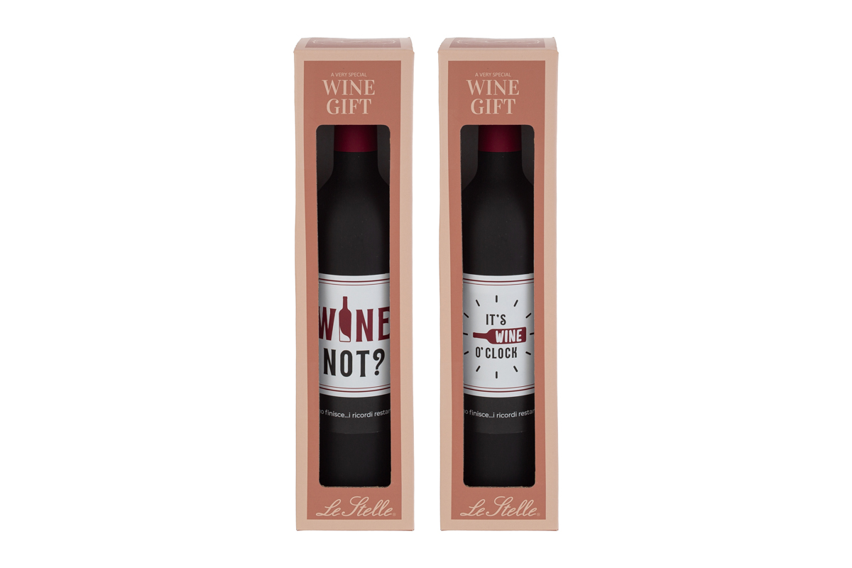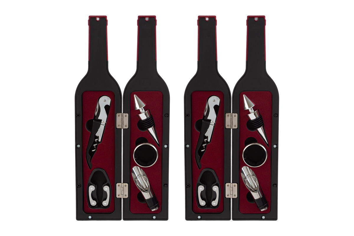Accessori cinque pezzi vino in bottiglia wine time - due modelli con scritta assortita - incluso di astuccio
