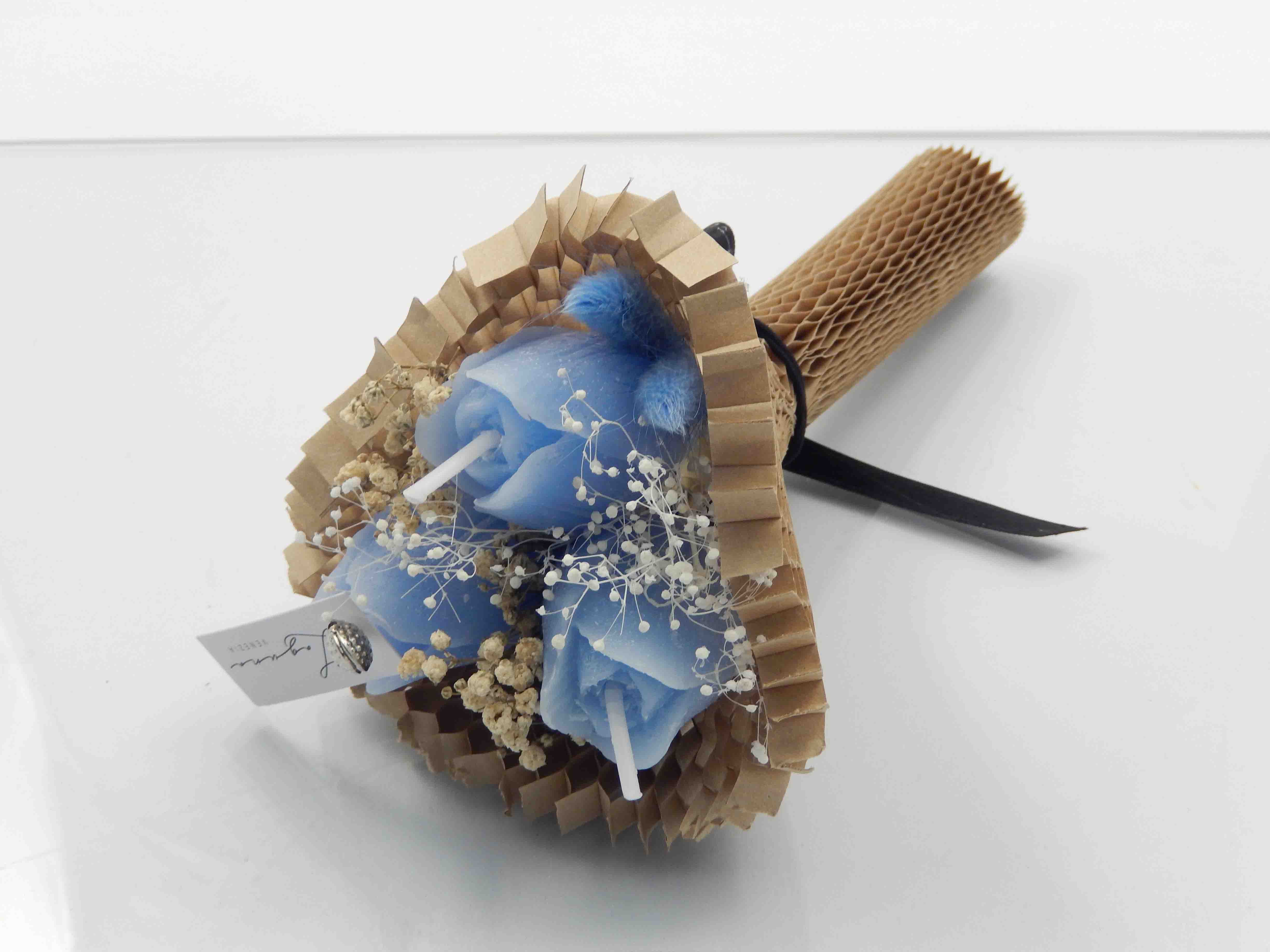 Bouquet in rete colore avana con tre tulipani candela azzurro - lung.cm.20