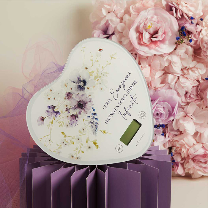 CLARALUNA-Bilancia pesa alimenti decoro floreale lilla - cm.23,5x22x2 - incluso di astuccio e portaconfetti- escluse batterie