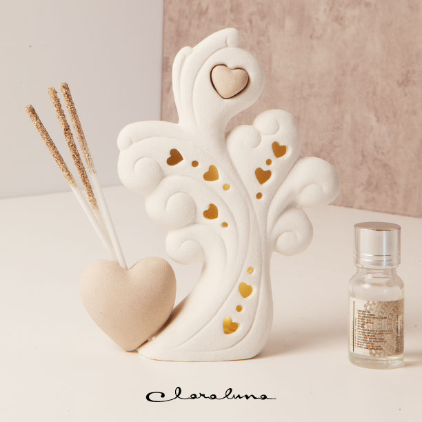 CLARALUNA Profumatore piccolo albero in porcellana con cuore tortora e luce led