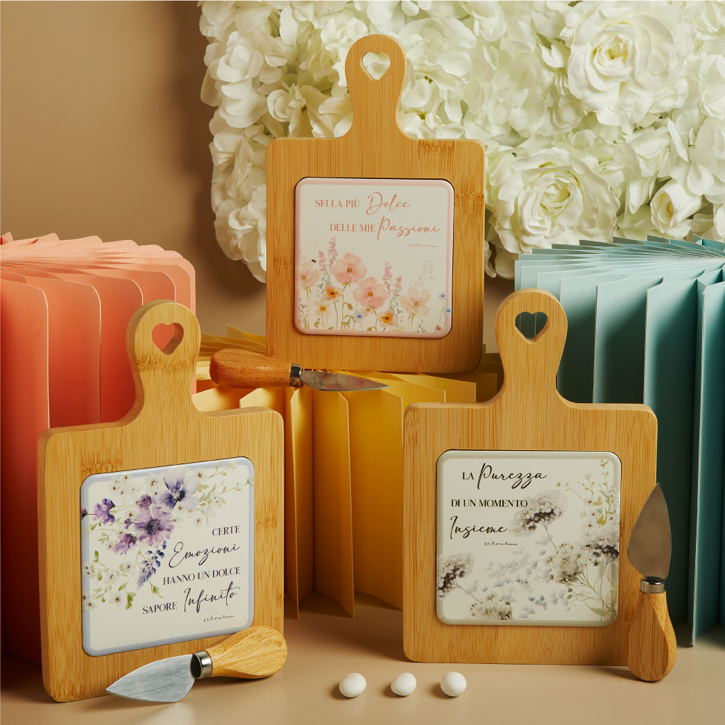 CLARALUNA-Tagliere bamboo con coltellino decoro floreale verde - cm.23x15x1,5 - incluso di astuccio e portaconfetti