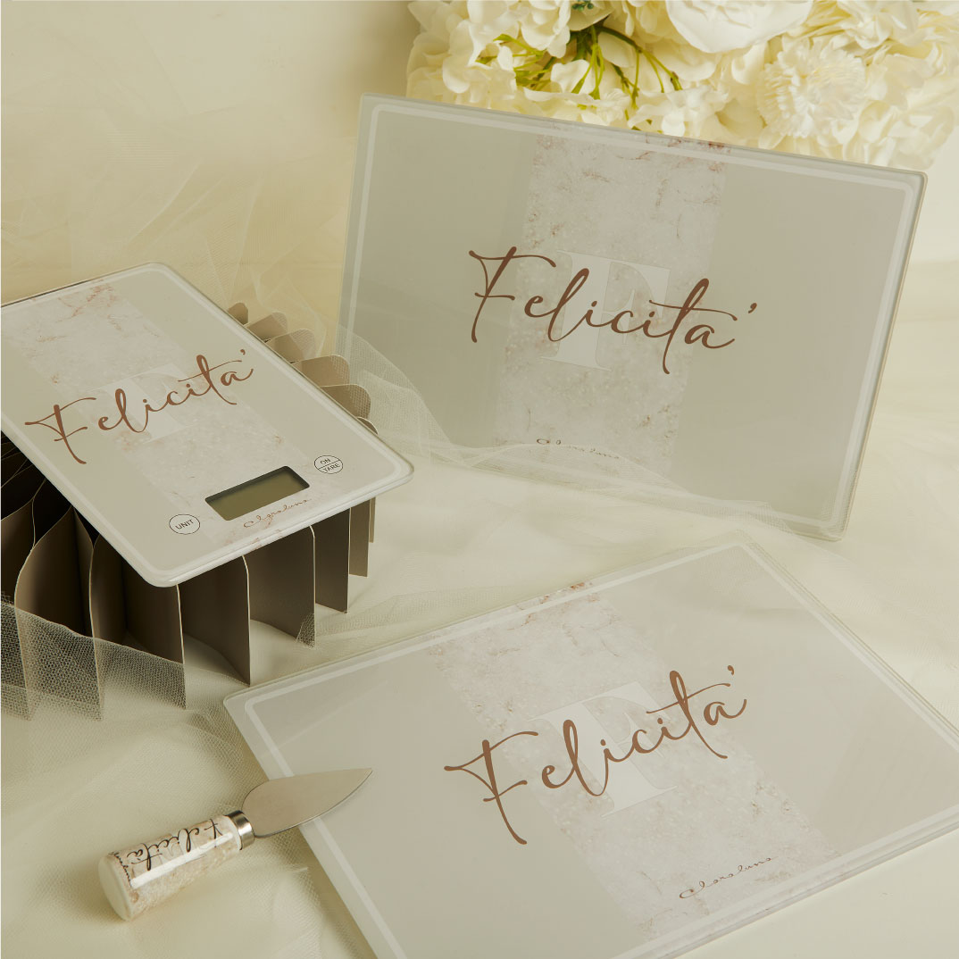 CLARALUNA-Tagliere in vetro con coltellino decoro felicità - cm.30x20x3,5 - incluso di astuccio e portaconfetti