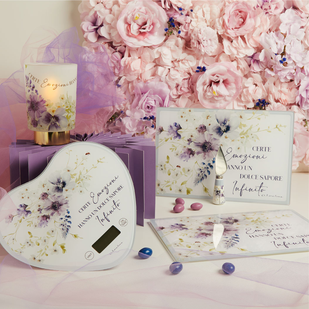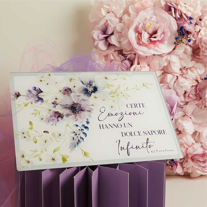 CLARALUNA-Tagliere in vetro decoro floreale lilla - cm.30x20x3,5 - incluso di astuccio e portaconfetti