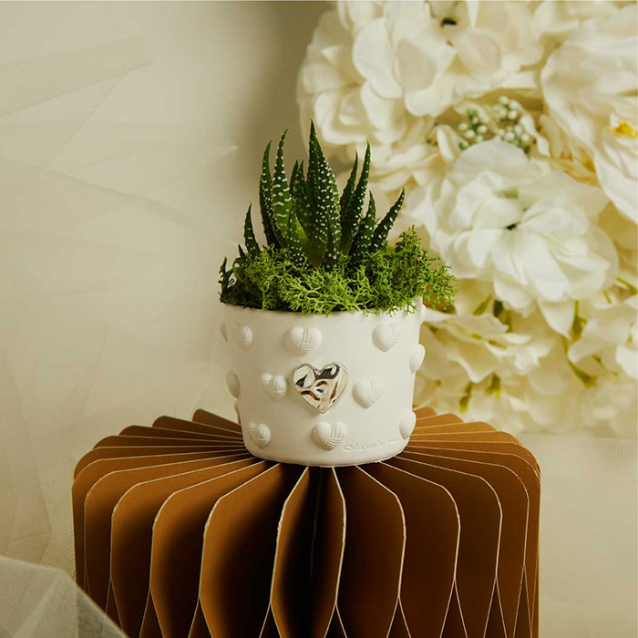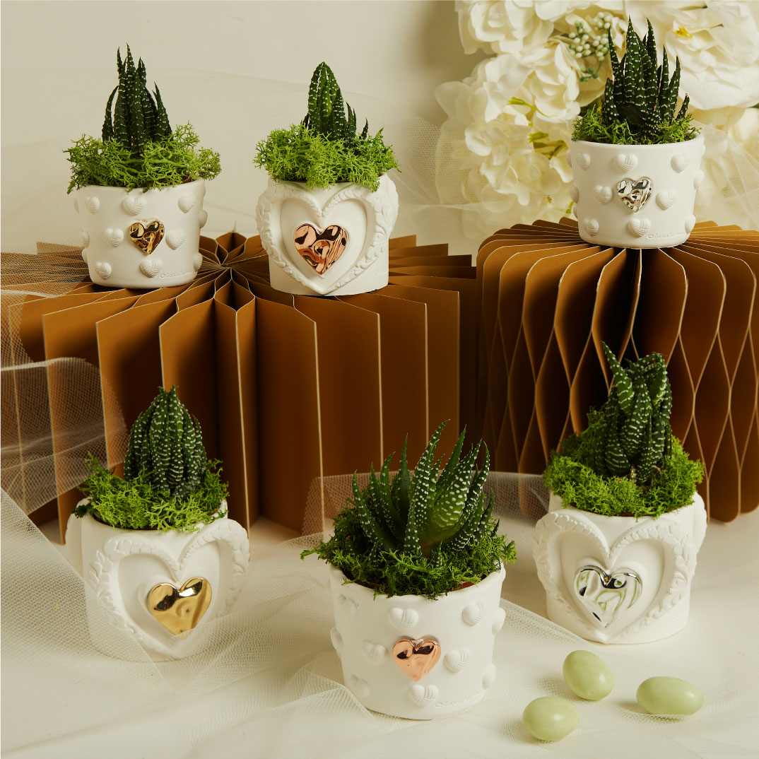 CLARALUNA-Vasetto cuoricini con applicazione cuore silver - cm.6x6,5 - incluso di piantina, astuccio e portaconfetti