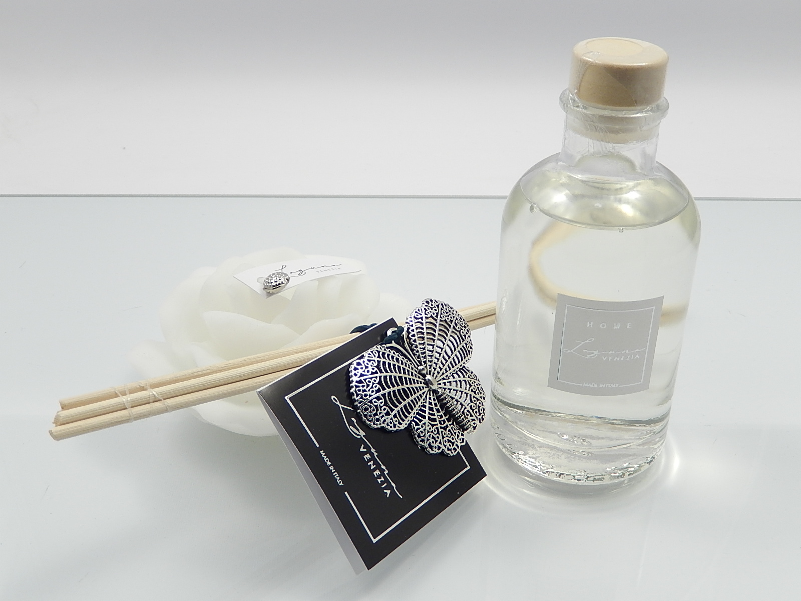 LAGUNA-Confezione profumatore 200 ml con candela colore bianco e farfalla in metallo - cm.20x20 - incluso di astuccio