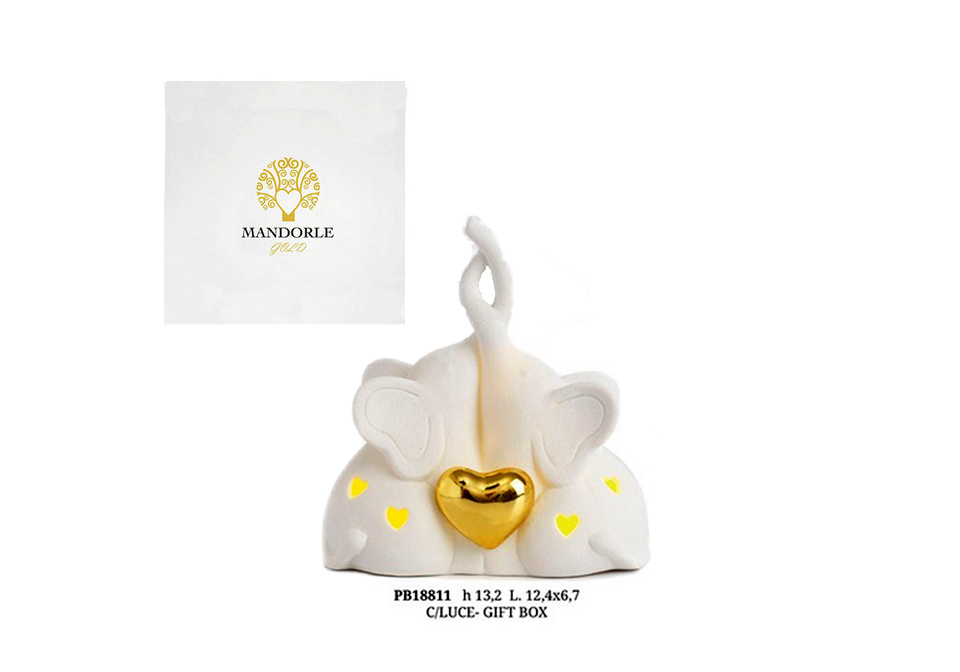 MANDORLE-Coppia elefanti porcellana cuore oro e luce led cm.13,2 con astuccio regalo