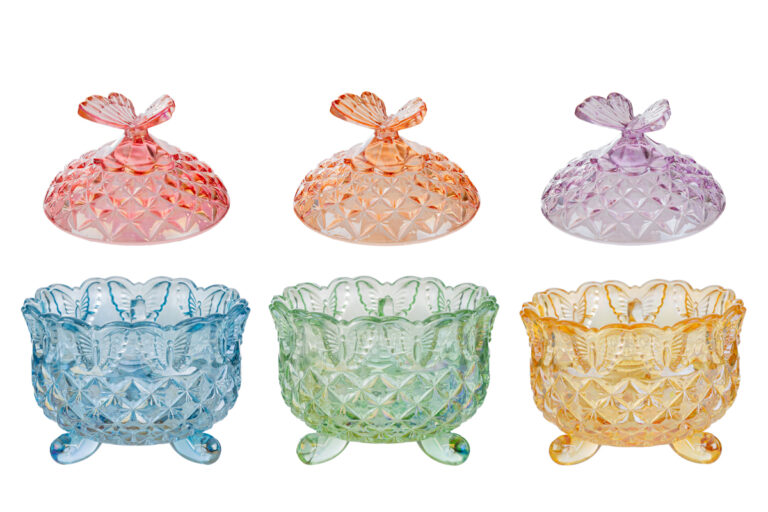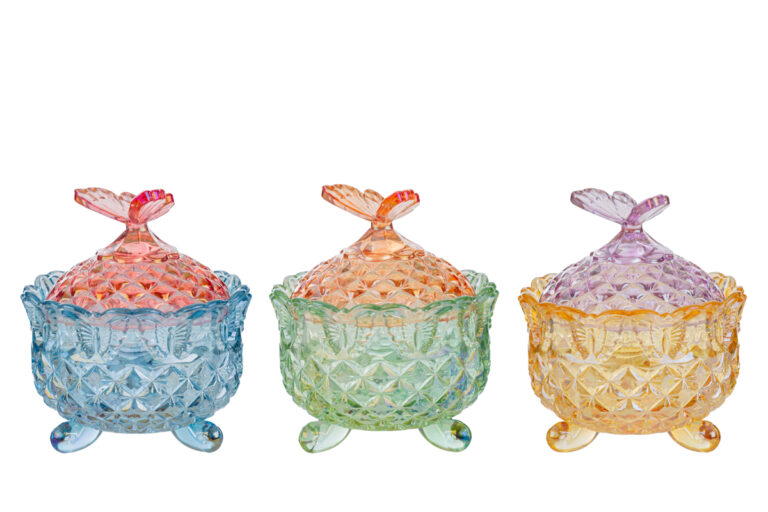 Scatola tonda in vetro farfalla in tre colori assortiti