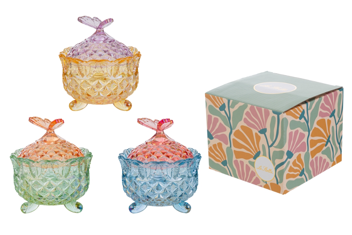 Scatola tonda in vetro farfalla in tre colori assortiti - cm.10,5xh.13 - inclusa di astuccio (il prezzo è riferito al singolo pezzo)