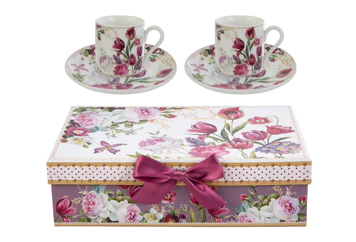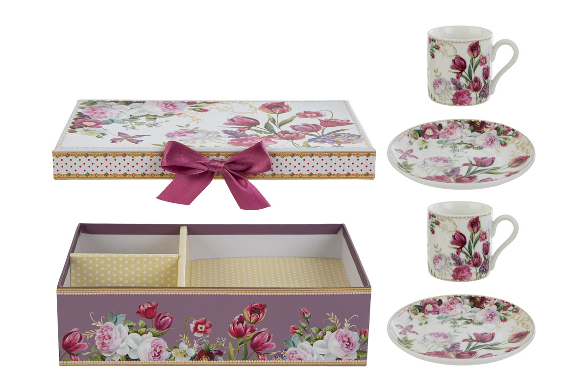 Set due tazze caffè bouquet di charme in porcellana - inclusa di astuccio - cm.22x13x6