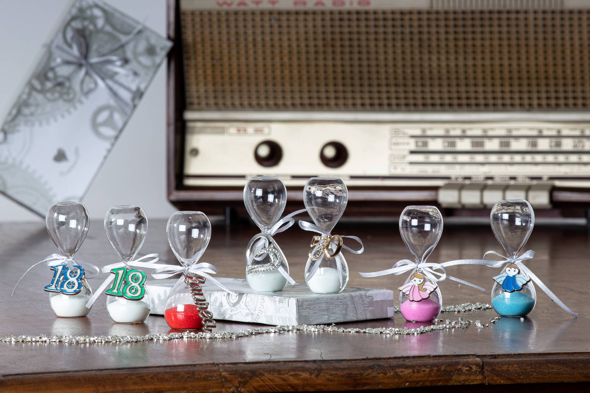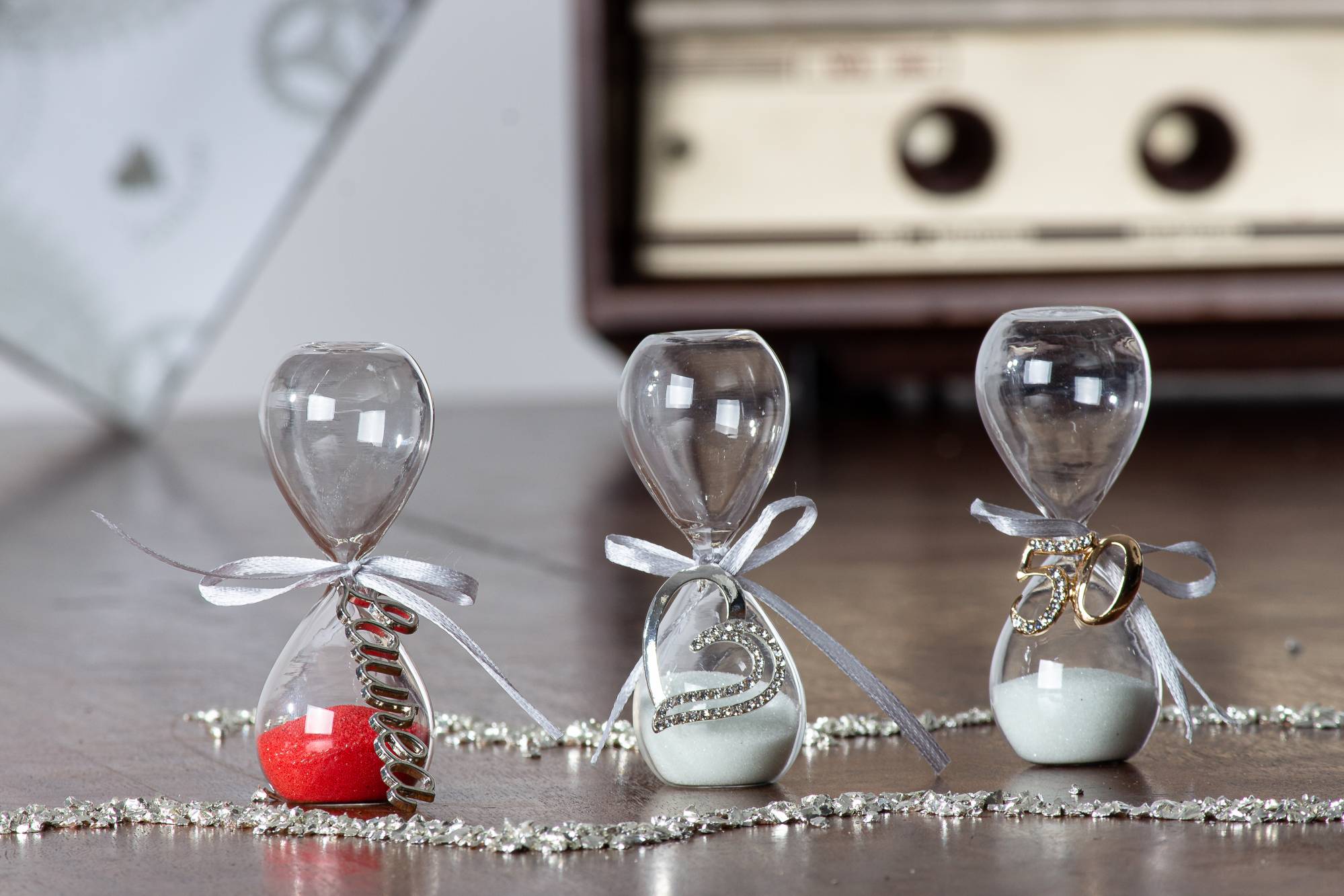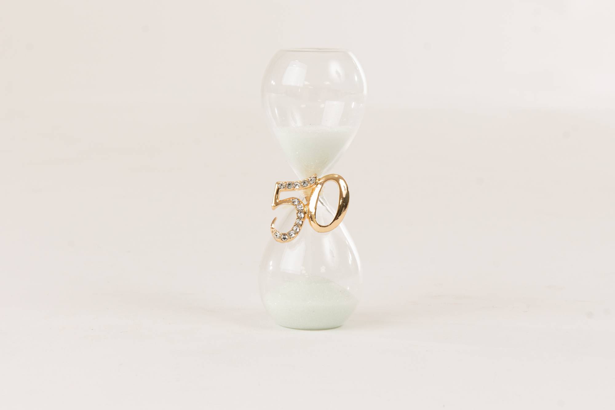 Bomboniere Cuorematto Clessidra in vetro sabbia bianca con applicazione 50° h.cm.8 (Acquistando un minimo 40 pezzi di questo articolo le partecipazioni sono in omaggio)