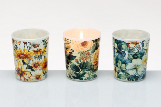 CUOREMATTO-Candela profumata in vetro tre colori assoriti cm.ø5,5xh.6 senza atuccio