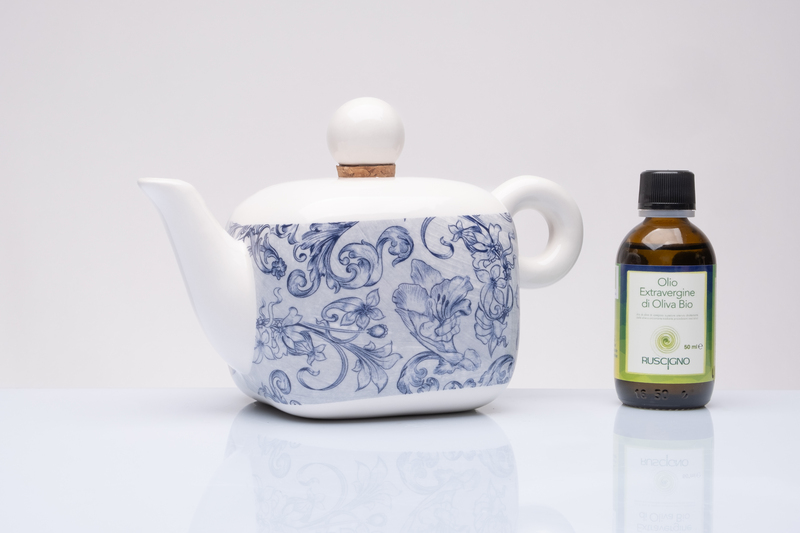CUOREMATTO-Oliera in porcellana decoro fregio con olio - cm.18x10xh.12 - Scegliendo le bomboniere di Cuorematto:fai del bene e ricevi, con un acquisto minimo di 40 pezzi,le Partecipazioni in omaggio