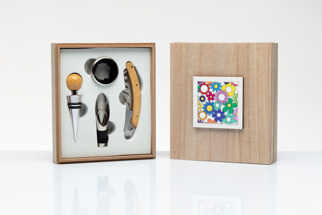 CUOREMATTO-Scatola in legno 4 attrezzi vino decoro fiorello cm.16x14xh.14 - Scegli le bomboniere di Cuorematto:fai del bene e ricevi, con un acquisto minimo di 40 pezzi,le Partecipazioni e il Sito del tuo matrimonio in omaggio