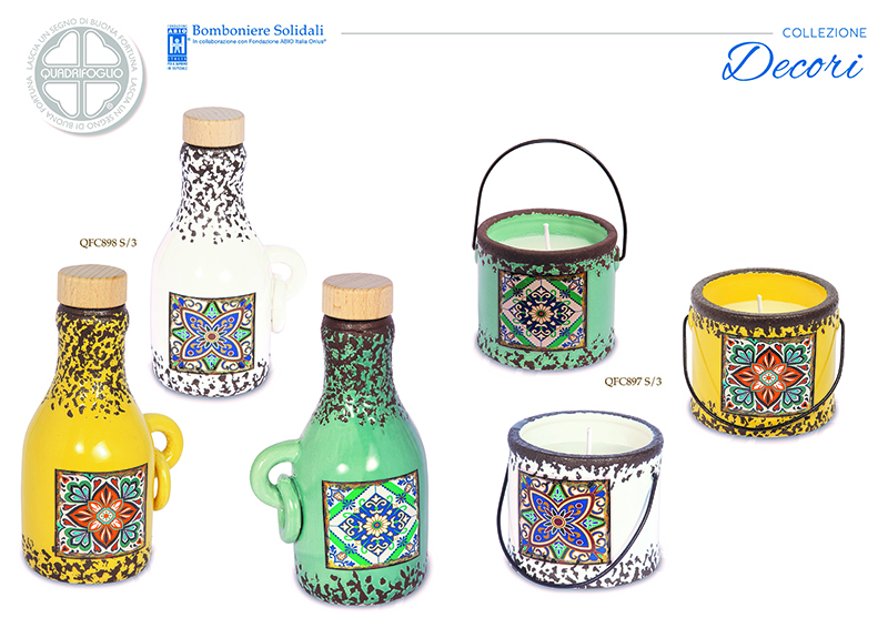 Serie Decori  Candela in porcellana set da 3 pezzi assortiti - cm.ø 7xh.10 (il prezzo è riferito al tris - articolo soggetto a quantità limitata chiedere in azienda prima di effettuare l'ordine) ** Acquistando le bomboniere Serie Quadrifoglio, sostieni il progetto di solidarietà a favore della Fondazione Abio Italia Onluss - per maggiori informazioni vedi https://www.bombonierequadrifoglio.it/ **