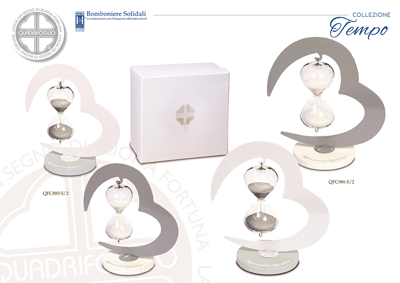 Serie Tempo  Clessidra set da due pezzi in vetro colori assortiti su supporto di metallo inclusa di astuccio di cartone - cm.14xh.15 (il prezzo è riferito alla coppia - articolo soggetto a quantità limitata chiedere in azienda prima di effettuare l'ordine) ** Acquistando le bomboniere Serie Quadrifoglio, sostieni il progetto di solidarietà a favore della Fondazione Abio Italia Onluss - per maggiori informazioni vedi https://www.bombonierequadrifoglio.it/ **