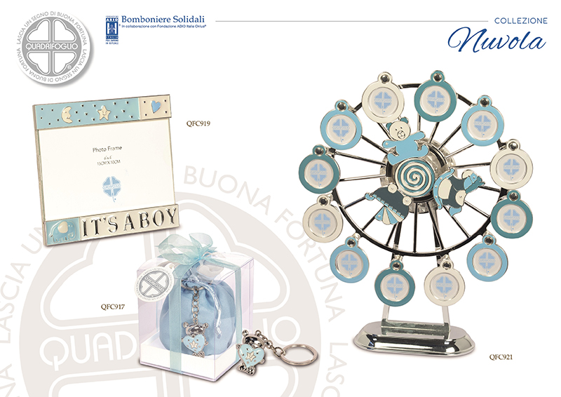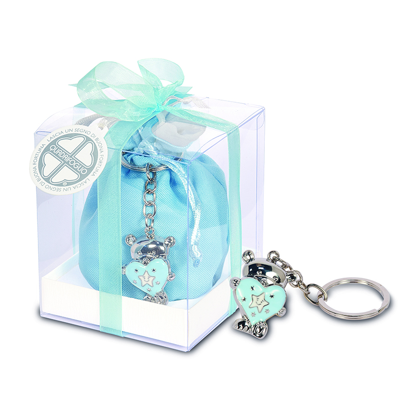 Serie Nuovola Portachiavi cuore celeste in metallo con sacchetto  in stoffa con scatola trasparente inclusa - cm.10 (articolo soggetto a quantità limitata chiedere in azienda prima di effettuare l'ordine) ** Acquistando le bomboniere Serie Quadrifoglio, sostieni il progetto di solidarietà a favore della Fondazione Abio Italia Onluss - per maggiori informazioni vedi https://www.bombonierequadrifoglio.it/ **