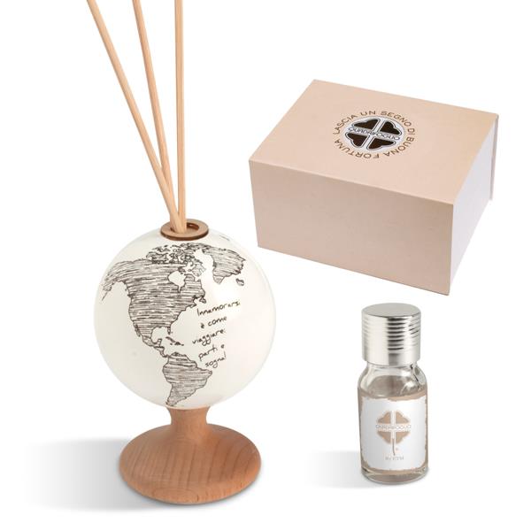 Quadrifoglio Profumatore modello mondo in vetro su supporto di legno cm.dm.6xh.10 -  incluso di astuccio regalo e kit essenza (Grazie all'acquisto delle bomboniere solidali quadrifoglio ETM, sosteniamo la fondazione ABIO.ORG ITALIA ) ** Acquistando un minimo di 40 pezzi, le partecipazioni di nozze sono in omaggio **