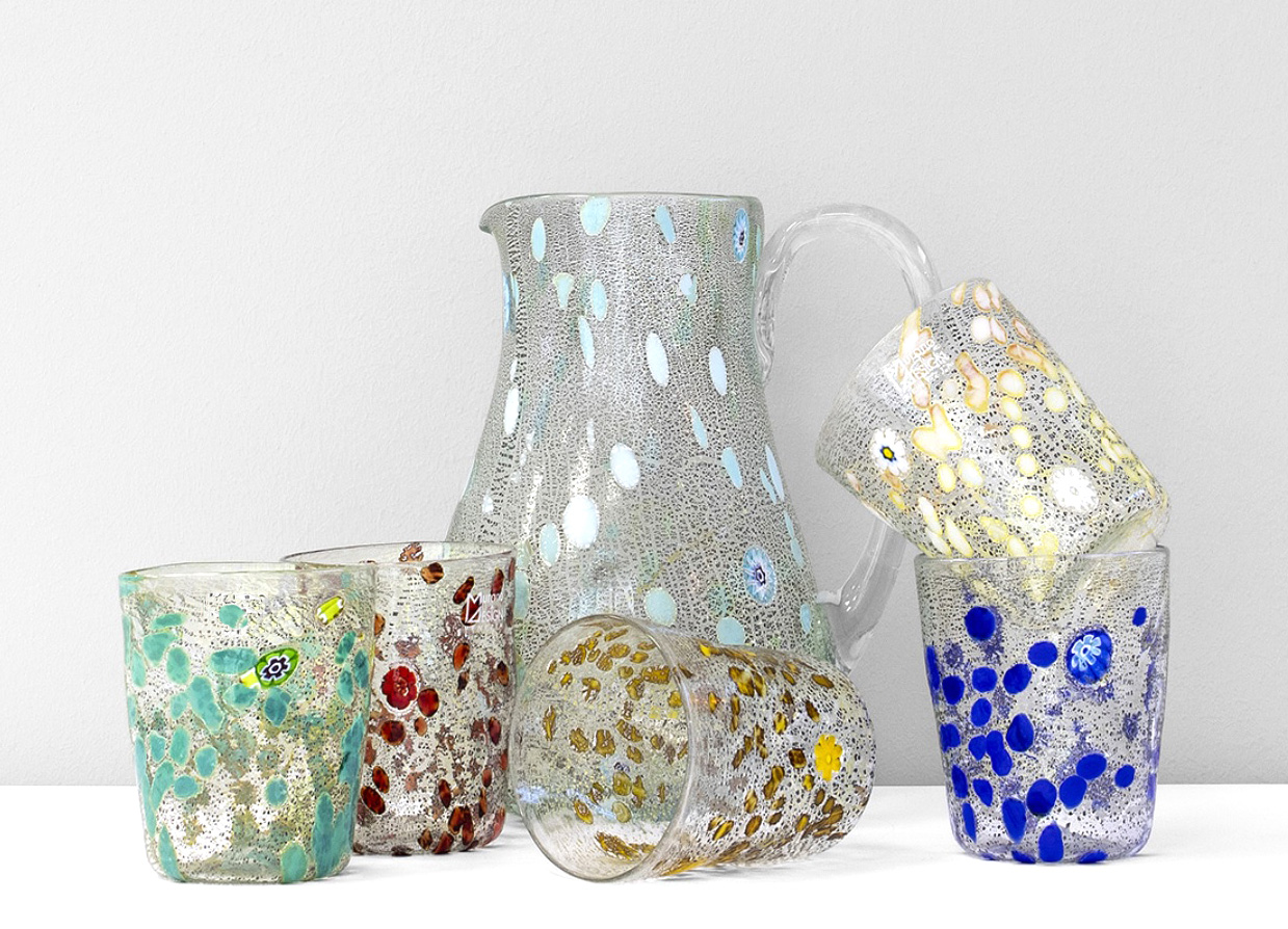Caraffa in vetro di Murano trasparente con foglia d'argento, macchie e murrine in tinta. Disponibile 7 colori -h.cm.25 (articolo fatto interamente a mano con tempi di produzione minimi di 15 giorni)